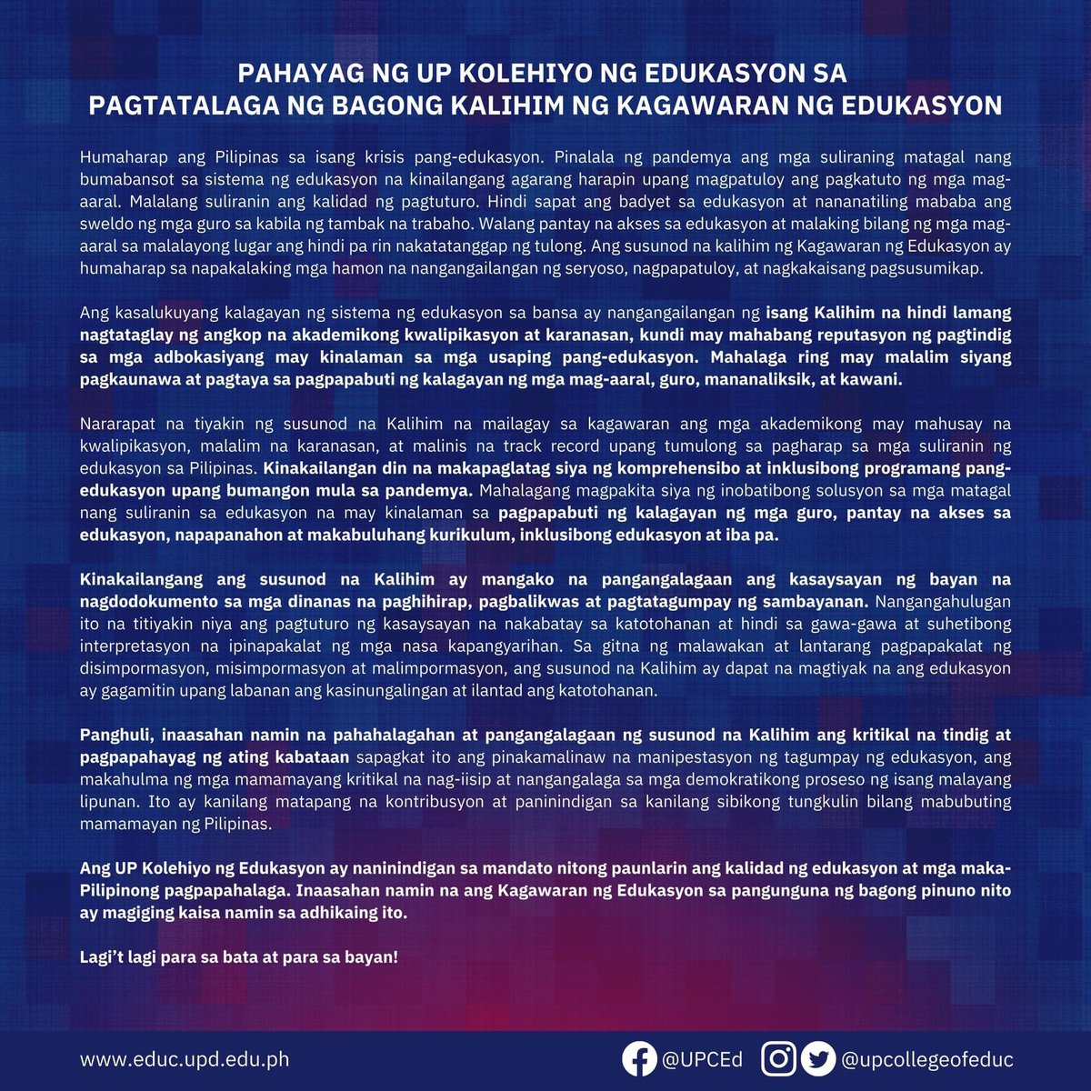 Stanley Buenafe Gajete On Twitter Look The Up College Of Education Releases A Statement On The Possible Appointment Of Sara Duterte As Secretary Of Education It Says Ph Is Currently Facing An Education Crisis And It Demands A Comprehensive Plan A