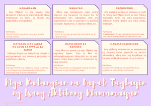 Araling Panlipunan10 Aktibong Pakikilahok ng Mamamayan sa GawaingAraling Panlipunan10 Aktibong Pakikilahok ng Mamamayan sa Gawaing Pansibiko Image transcription textGawain B Tukuyin kung saang kategorya tuwirang nauugnay angsumusunod na mga halimbawa ng civic engagement. AKTIBONG MAMAMAYAN MARY GRACE MANGINGA WHAT MAKABAYAN add subtopics Isang katangian na dapat nating taglayin ay ang pagiging makabayan. Ang mga mag-aaral ay guguhit ng isang larawan na nagpapakita ng mga katangian ng isang aktibong mamamayan.