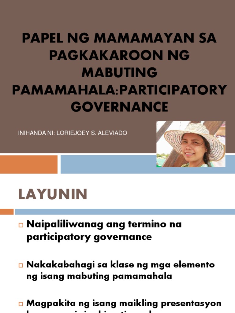 Up to 3 cash back Papel ng Mamamayan sa Pagkakaroon ng Mabuting Pamamahala Democracy - View presentation slides online. Hindi ipinagbibili Gawain 2.