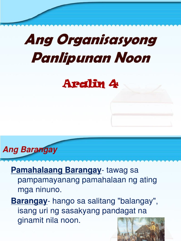 Ang ating Barangayay isang lugar kung saan nahuhubog ang ating pagkataosa ating Barangay matatagpuan ang mga tao na una natin makakasalamuha gaya ng mga. Want this question answered. Sumama sa pagpupulong ukol sa ikauunlad ng barangay.