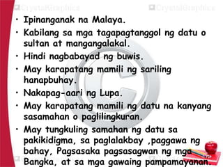 Anu ang mga tungkulin ng batang Filipino. Iginagalang ang watawat ng Pilipinas 4. Sumusunod sa batas trapiko 6.