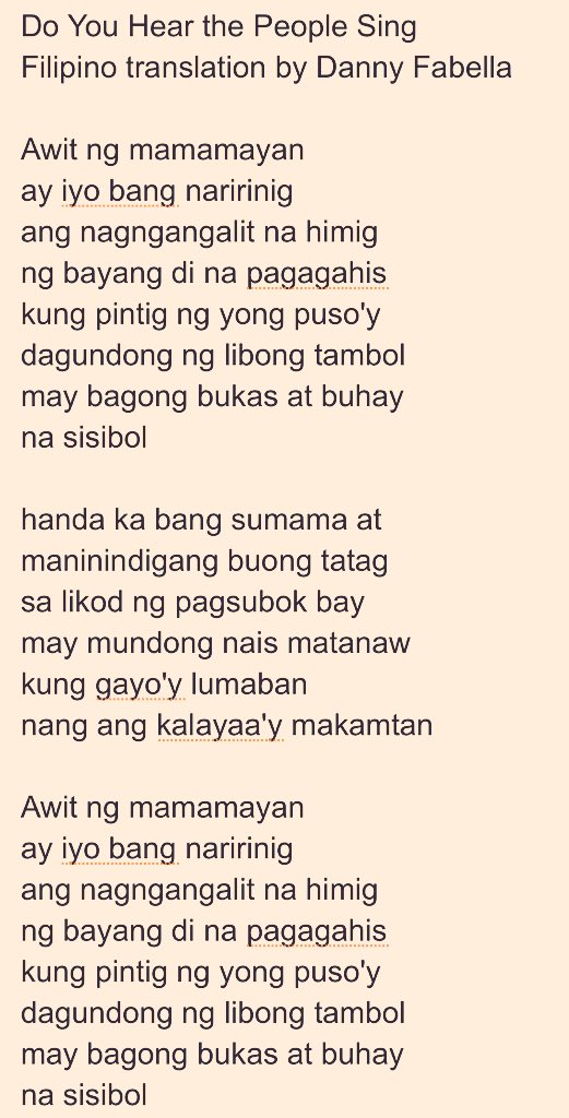 Tonyo Cruz On Twitter Awit Ng Mamamayan Filipino Translation Of Do You Hear The People Sing By Danny Fabella Https T Co I2q976ntxs Twitter