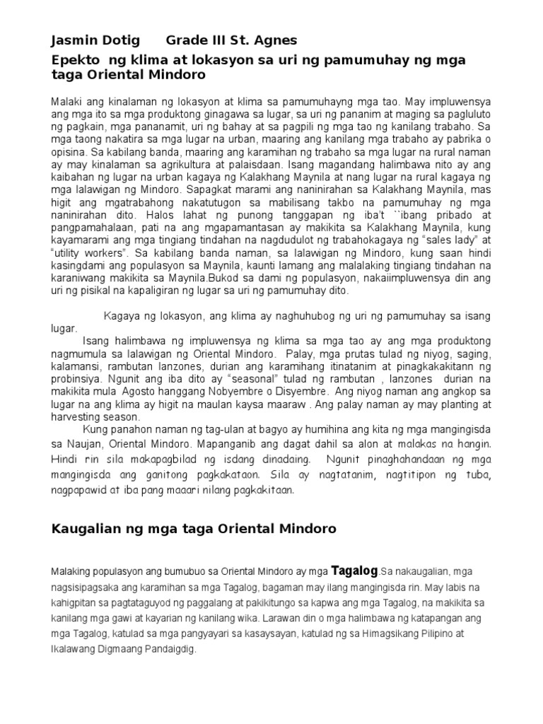 Epekto Ng Klima At Lokasyon Sa Uri Ng Pamumuhay Ng Mga Taga Oriental Mindoro Pdf