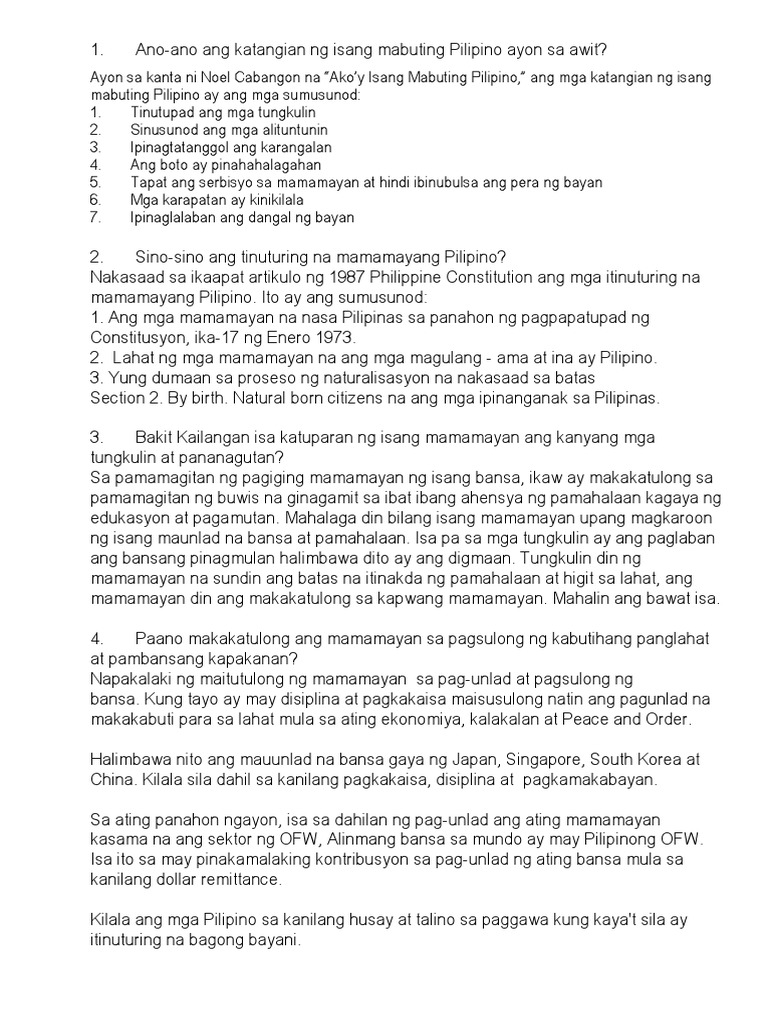 Sanaysay tungkol sa pagiging isang mabuting mamamayang pilipino. Ang pagiging mamamayang Asyano ay dapat nating pahalagahandahil ang bansang asya ay mayaman sa kulturaHistoryaPaniniwala at Likas na yamanDapat itong. Isulat sa patlang ang letra ng tamang sa. Bago ko simulan ang aking.